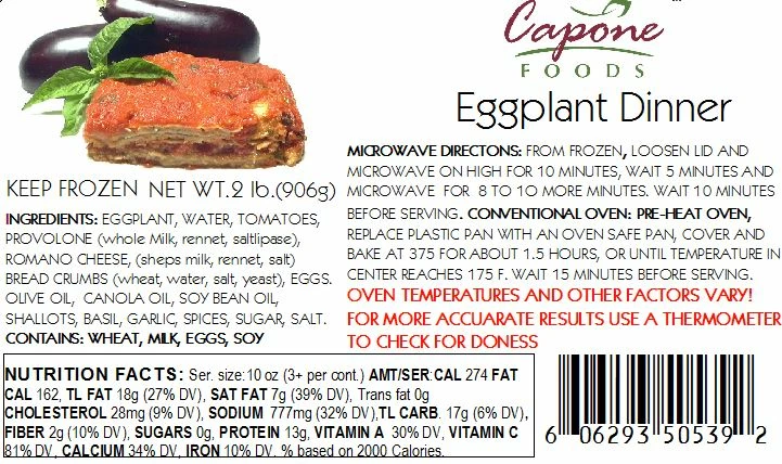 Perfectly cooked breaded eggplant with just the right balance our Plum Tomato and Basil sauce, Pecorino Romano and Provolone cheeses and fresh basil. Prepare in a microwave or conventional oven. We must warn you, this dish could become addictive. Remember, as with all our prepared entrees, allow to rest and settle for 10 to 15 minutes before serving.