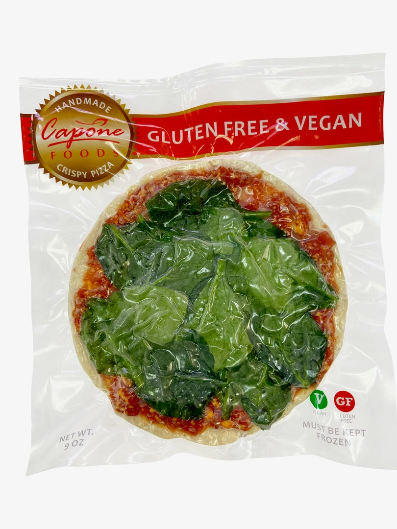 *PERISHABLE. Made with a gluten free blend of flour. Topped with drained tomatoes seasoned with olive oil and spinach sauteed with shallots. All natural, no preservatives. Sold frozen and cooks in about 15 minutes. *VEGAN AND GLUTEN FREE*