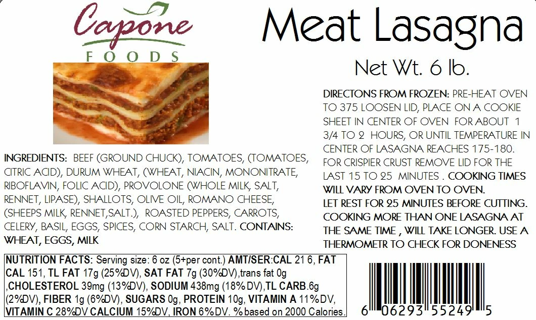 Fresh pasta layered with ground beef, shallots, garlic, celery, carrots, red bell peppers and plum tomato sauce. Topped with an asiago breadcrumb blend. 6lbs, serves 8-10 people.