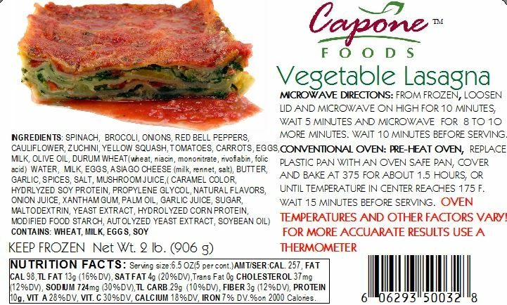 We begin with onions and red bell peppers sautĂ©ed in extra virgin olive oil until they are tender, sweet, and bursting with flavors. Then we add spinach, carrots, zucchini, broccoli and cauliflower and blend in a  mushroom bĂ©chamel sauce. For added flavor, the lasagna is topped with a thin layer of our Plum Tomato and Basil sauce, Asiago cheese and bread crumbs. This very flavorful lasagna can be prepared in a microwave or conventional oven. Remember, as with all our prepared entrees, allow to rest and settle for 10 to 15 minutes before serving.Â