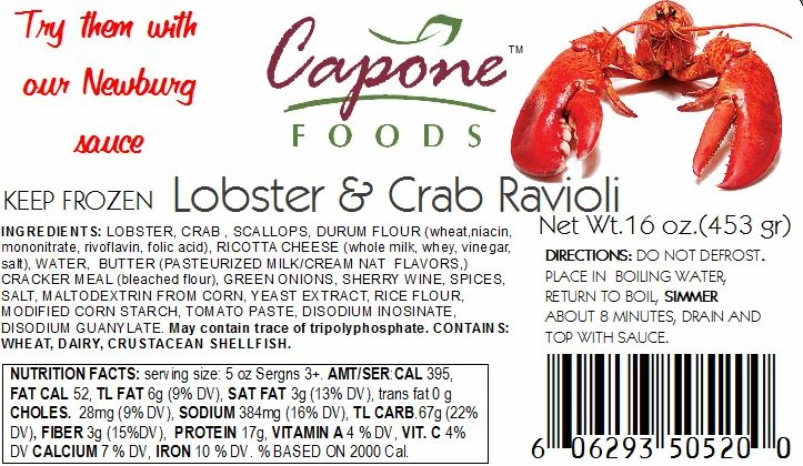 *PERISHABLE* Thin pasta filled with fresh lobster and crab meat bound with a mixture of scallops, shallots, sherry wine and fresh herbs and spices. We suggest our Alfredo with shallots sauce or our classic Newburg sauce.