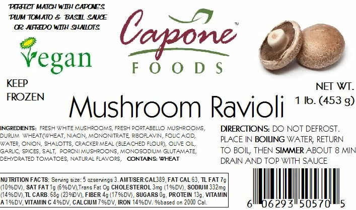 *PERISHABLE* Thin pasta filled a mixture of Portobello and white mushrooms, shallots, extra virgin olive oil, enhanced with a reduction of Morels and Chanterelle mushrooms. Top them with our Quick tomato sauce for a Vegan meal. Or have them as an appetizer with one of our flavorful Plum tomato sauces.