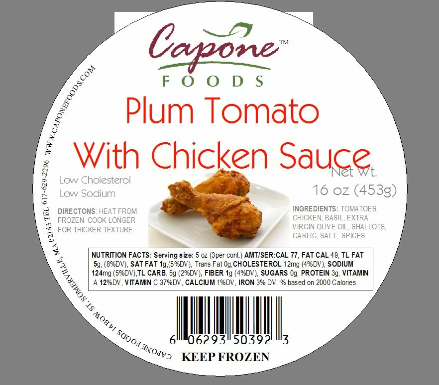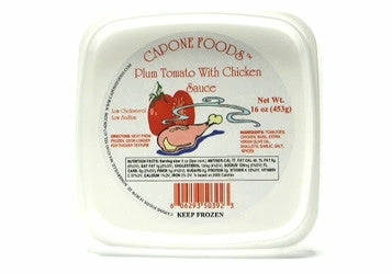 Typical of sauces made in the home of many Italians. This relatively thin sauce derives its flavor from just a few ingredients. Made from plum tomatoes, extra virgin olive oil which is infused with roasted garlic, fresh sautéed chicken, shallots, fresh basil leaves, white pepper and salt.