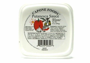 This southern Italian spicy red sauce is made from tomatoes, olives, onions, anchovies, extra virgin olive oil, capers, fresh garlic, fresh parsley, roasted peppers, red wine, red pepper flakes and salt. Full assertive flavor. Hot and spicy, but not overwhelming. Great on squid ink pasta.