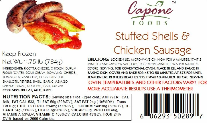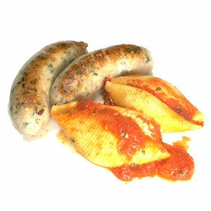 Our famous Stuffed shell. Combined with ever popular Chicken and Pancetta Sausages, topped with our signature Plum Tomato and Basil sauce. 4 shell and 2 sausages per container per container. Remember, as with all our prepared entrees, allow to rest and settle for 10 to 15 minutes before serving.Â