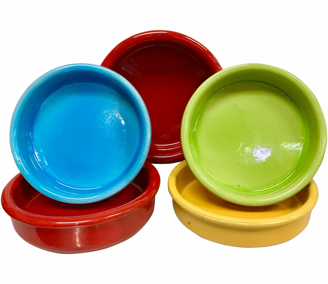 Rustic terracotta in traditional Mediterranean colors from Breda, Catalonia and similar in shape to a casserole dish and glazed on the inside to retain moisture and cooking liquids, these can be used in place of a sauce pan or skillet and can also be used as a paella pan or as an oven casserole. Holds a slow and steady heat, allowing foods to cook gently and evenly and retains heat when removed from the stove or oven allowing cooking to continue at the table for a dramatic presentation.