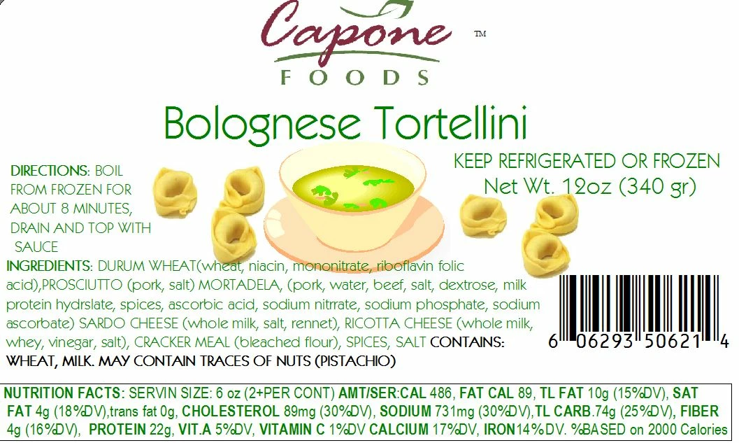 Delicate egg pasta filled with a robust mixture of imported Prosciutto, Mortadella and Parmigiano Reggiano cheese. In Italy it is served in a thin and flavorful chicken stock as a first or second course. Or blend them with our Alfredo sauce, fresh peas and thinly sliced prosciutto for an other classic way of preparing a memorable main course. 3/4 lb container. SHIPPED FROZEN